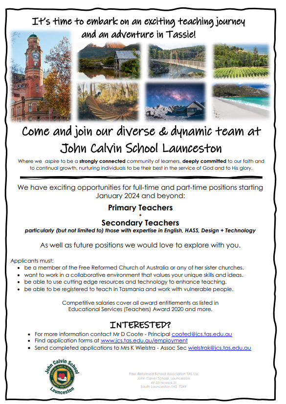 If you are a qualified teacher who is a member of one of the Free Reformed Churches of Australia or a Sister Church, feel free to contact us with enquiries about future employment.