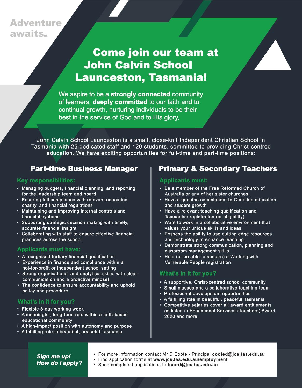 If you are a qualified teacher who is a member of one of the Free Reformed Churches of Australia or a Sister Church, feel free to contact us with enquiries about future employment.
